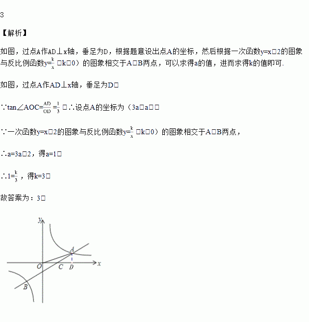 如图,一次函数y=x﹣2的图象与反比例函数y=(k>0)的图象相交于A、B两点,与x轴交与点C,若tan∠AOC=,则k的值为_____.