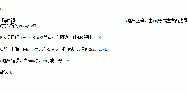 A. 由x=y,得到x+2=y+2