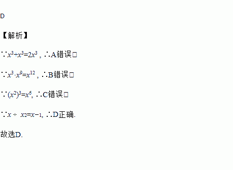 A. x3+x3=x6 B. x3•x9=x27 C. (x2)3=x5 D. x÷x2=x-1