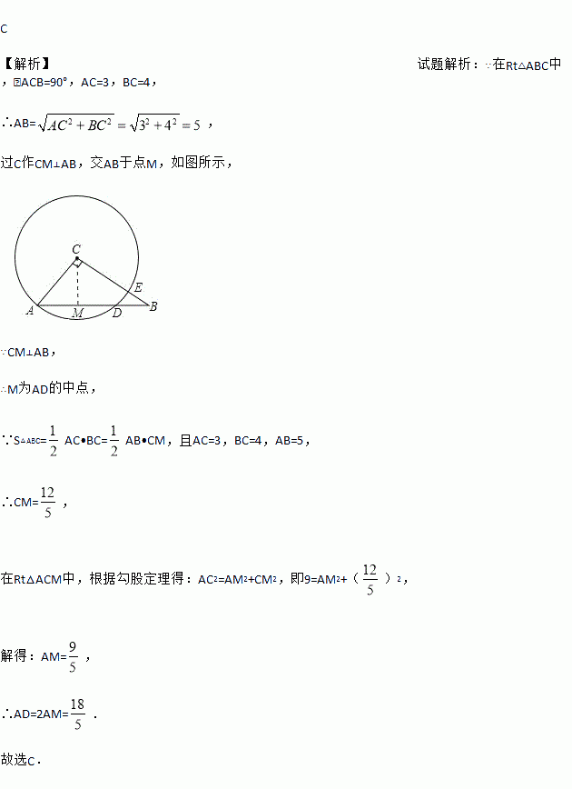 如图,在Rt△ABC中,∠ACB=90°,AC=3,BC=4,以点C为圆心,CA为半径的圆与AB交于点D,则AD的长为( )