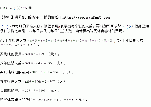 学校决定按每人一根跳绳、一个毽球,两人一副羽毛球拍的标准,购买相应的体育器材以满足学生锻炼需要,其中跳绳每根![]()