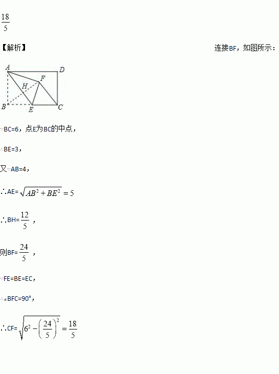 如图,在矩形ABCD中,AB=4,BC=6,点E为BC的中点,将△ABE沿AE折叠,使点B落在矩形内点F处,连接CF,则CF的长为___________.