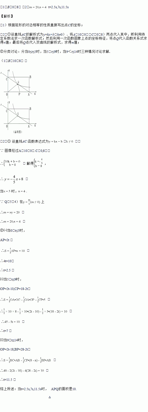 ②若动点P从A点出发,沿折线AO→OC→CB的路径以每秒2个单位长度的速度运动,到达B处停止,△APQ的面积为S,当t取何值时,S=10.