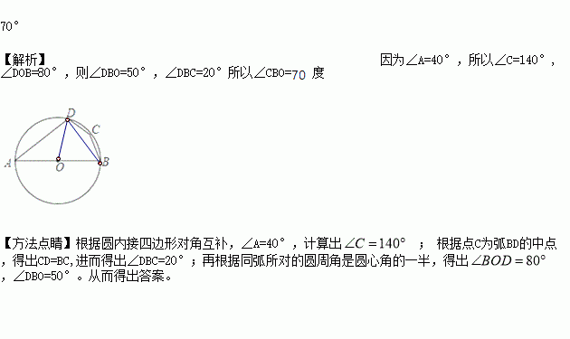 如图,四边形ABCD内接于⊙O,AB为⊙O的直径,点C为的中点.若∠A=40°,则∠B=________.