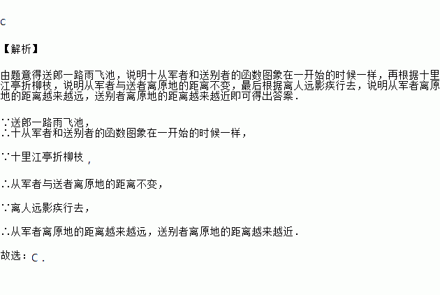 “古诗•送郎从军:送郎一路雨飞池,十里江亭折柳枝;离人远影疾行去,归来梦醒度相思.”中,如果用纵轴y表示从军者与送别者行进中离原地的距离,用横轴x表示送别进行的时间,从军者的图象为O→A→B→C,送别者的图象为O→A→B→D,那么下面的图象与上述诗的含义大致吻合的是( )