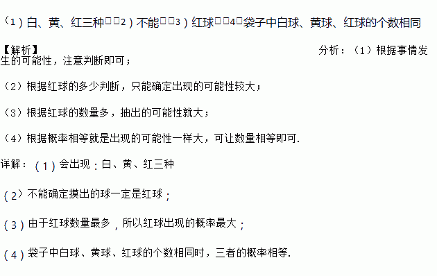 (4)怎样改变袋子中白球、黄球、红球的个数,使摸到这些颜色的球的概率相等?