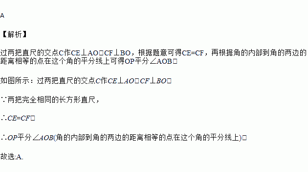 小明同学在学习了全等三角形的相关知识后发现,只用两把完全相同的长方形直尺就可以作出一个角的平分线.如图:一把直尺压住射线OB,另一把直尺压住射线OA并且与第一把直尺交于点P,小明说:“射线OP就是∠BOA的角平分线.”他这样做的依据是( )