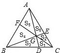 如图,△ABC中,点D、E、F分别在三边上,AD、BE、CF交于一点G,BD=2CD,面积S1=4,面积S2=3,则S△ABC=________.