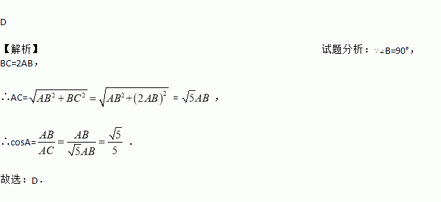 如图,△ABC中,∠B=90°,BC=2AB,则cos A=( )