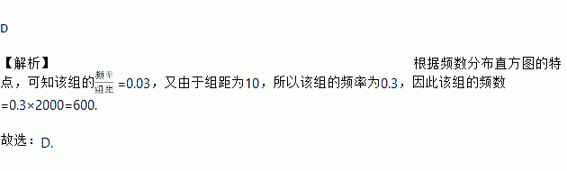 2000辆汽车通过某一段公路时的时速的频率分布直方图如下图所示,时速大于等于50且小于60的汽车大约有( )