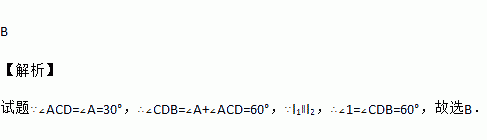 (2017•乐山)含30°角的直角三角板与直线l1、l2的位置关系如图所示,已知l1∥l2,∠ACD=∠A,则∠1=( )