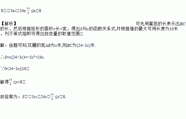 如图,有长为24米的篱笆,一面利用墙(墙的最大可用长度为10米),围成中间隔有一道篱笆的长方形花圃.设花圃的宽AB为x米,面积为S平方米.则S与x的函数关系式是____________,自变量x的取值范围是____________.