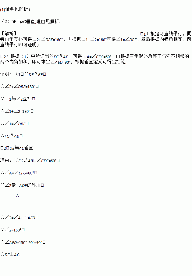 (2)若∠CFG=60°,∠2=150°,则DE与AC垂直吗?请说明理由.
