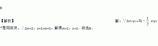 B 【解析】【解析】 ∵3x2myn+1与﹣x2ym+3是同类项,∴2m=2,n+1=m+3,解得m=1,n=3.故选B.