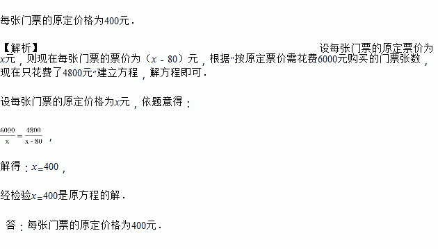 在某市举行的大型商业演出活动中,对团体购买门票思想优惠,决定在原定票价的基础上每张降价80 元,这样按原定票价需花 6000 元购买的门票张数,现在只花费了 4800 元,求每张门票的原定价格?