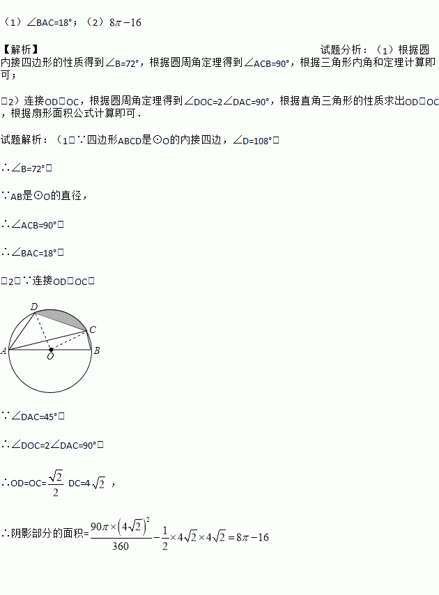 如图,四边形ABCD是⊙O的内接四边形,AB是⊙O的直径,∠D=108°,连接AC.(1)求∠BAC的度数;(2)若∠DAC=45°,DC=8,求图中阴影部分的面积(保留π).