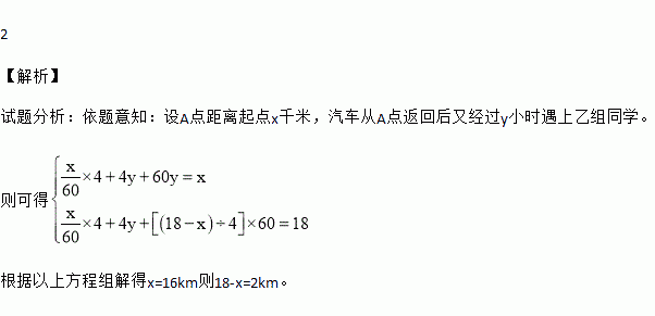 某班同学去18千米的北山郊游。只有一辆汽车,需分两组,甲组先乘车、乙组步行。车行至A处,甲组下车步行,汽车返回接乙组(上下车时间忽略不计),最后两组同时达到北山站。已知汽车速度是60千米/时,步行速度是4千米/时,求A点距北山站的距离为 千米。