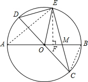 已知:如图,在半径为4的⊙O中,AB、CD是两条直径,M为OB的中点,CM的延长线交⊙O于点E,且EM>MC.连接DE,DE=