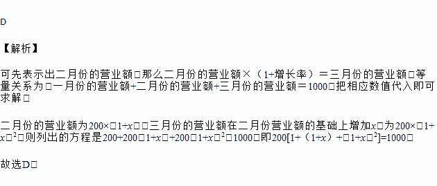 某超市一月份的营业额为200万元,已知第一季度的总营业额共1000万元,如果平均每月增长率为x,则由题意列方程应为