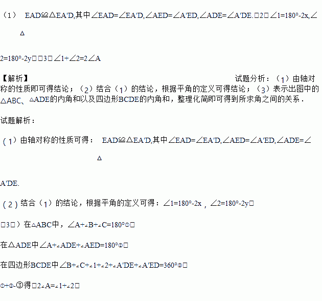 (2)设∠AED的度数为x,∠ADE的度数为y,那么∠1,∠2的度数分别是多少(用含有x或y的式子表示)?