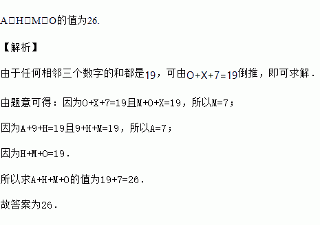 如图,方格中,除9和7外其余字母各表示一个数,已知任何三个连续方格中的数之和为19,求A+H+M+O的值.