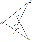 .分析:根据三角形内角与外角的关系可得∠A+∠B=∠2,∠D+∠E=∠1,再根据三角形内角和定理可得∠1+∠2+∠C=180°,进而可得答案.