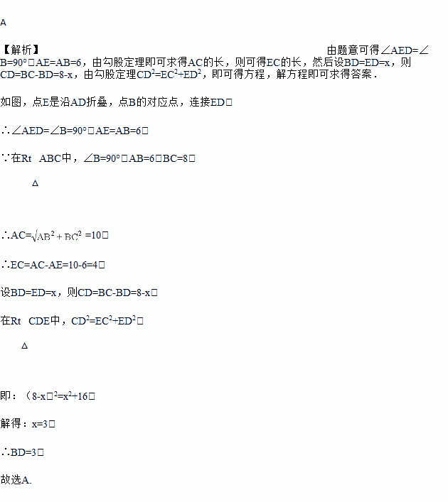 如图,有一块Rt△ABC的纸片,∠ABC=,AB=6,BC=8,将△ABC沿AD折叠,使点B落在AC上的E处,则BD的长为( )![]()