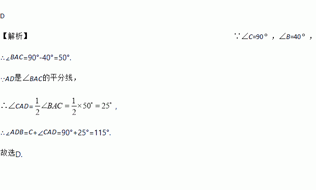 如图,△ABC中,∠C=90,∠B=40.AD是∠BAC的平分线,则∠ADB的度数为( )