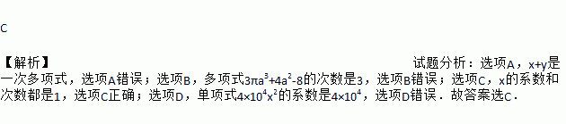 C 【解析】试题分析:选项A,x+y是一次多项式,选项A错误;选项B,多项式3πa3+4a2-8的次数是3,选项B错误;选项C,x的系数和次数都是1,选项C正确;选项D,单项式4×104x2的系数是4×104,选项D错误.故答案选C.