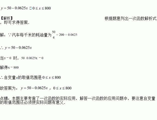 某油箱容量为50L的汽车,加满汽油后开了200km时,油箱中的汽油大约消耗了如果加满汽油后汽车行驶的路程为xkm,油箱中的剩油量为yL,则y与x之间的函数关系式和自变量取值范围分别是_____.