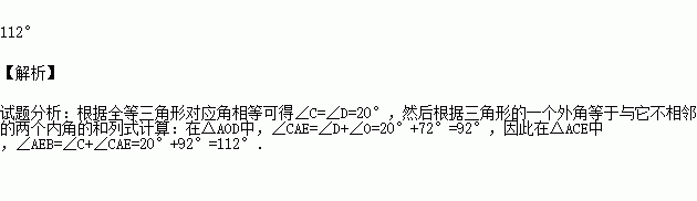 如图,△OAD≌△OBC,且∠O=72°,∠C=20°,则∠AEB= °.