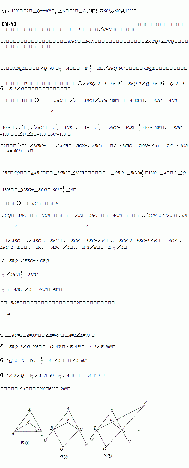 (3)如图③,延长线段BP、QC交于点E,△BQE中,存在一个内角等于另一个内角的2倍,求∠A的度数.