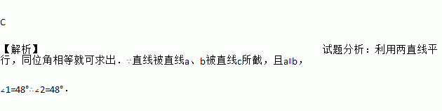 C 【解析】试题分析:利用两直线平行,同位角相等就可求出.∵直线被直线a、b被直线c所截,且a∥b, ∠1=48°∴∠2=48°.