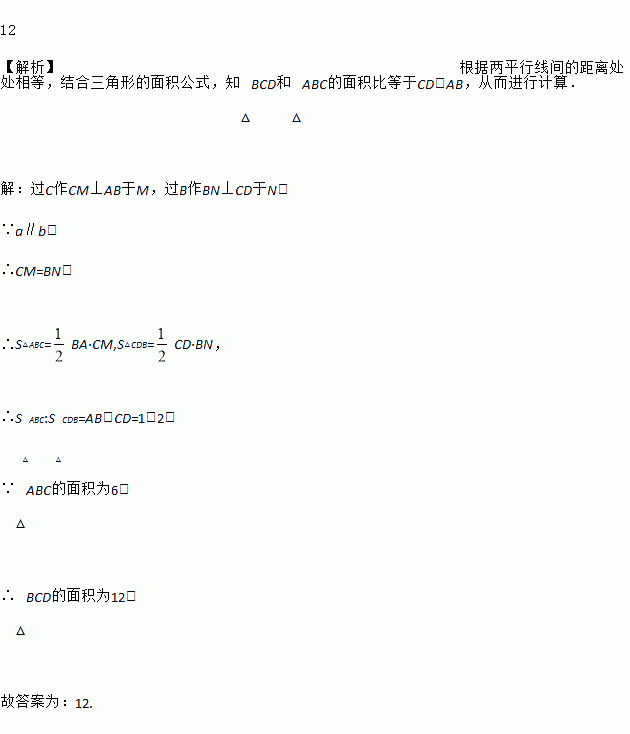 如图,直线a∥b,点A,B位于直线a上,点C,D位于直线b上,且AB∶CD=1∶2,若三角形ABC的面积为6,则三角形BCD的面积为__________.