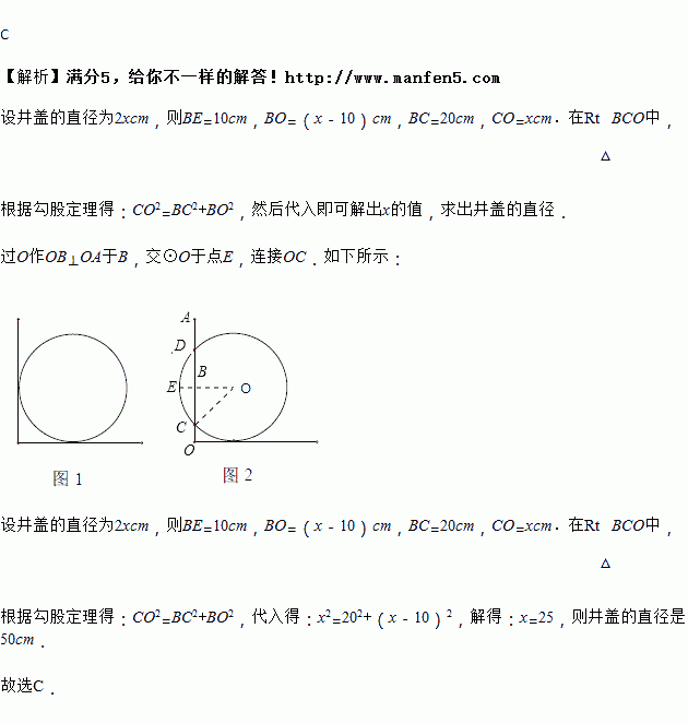 如图1,把圆形井盖卡在角尺〔角的两边互相垂直,一边有刻度)之间,即圆与两条直角边相切,现将角尺向右平移10cm,如图2,OA边与圆的两个交点对应CD的长为40cm则可知井盖的直径是( )