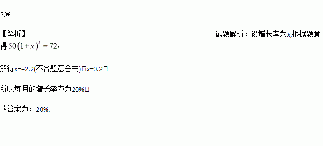 某超市九月份的营业额为50万元,十一月份的营业额为72万元.则每月营业额的平均增长率为_______.