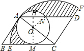 已知:如图平行四边形ABCD中,AC⊥CD,以C为圆心,CA为半径作圆弧交BC于E,交CD的延长线于点F,以AC上一点O为圆心OA为半径的圆与BC相切于点M,交AD于点N.若AC=6cm,OA=2cm.则图中阴影部分的面积为________cm2.