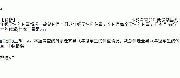 为了了解某县八年级学生的体重情况,从中抽取了200名学生进行体重测试 .在这个问题中,下列说法错误的是( )
