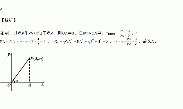 如图,在平面直角坐标系中,P是第一象限内的点,其坐标是(3,m),且OP与x轴正半轴的夹角α的正切值是,则sinα的值是( )