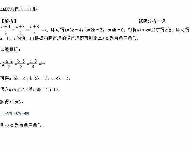 已知a、b、c是△ABC的三边,且满足,且a+b+c=12,请你探索△ABC的形状.