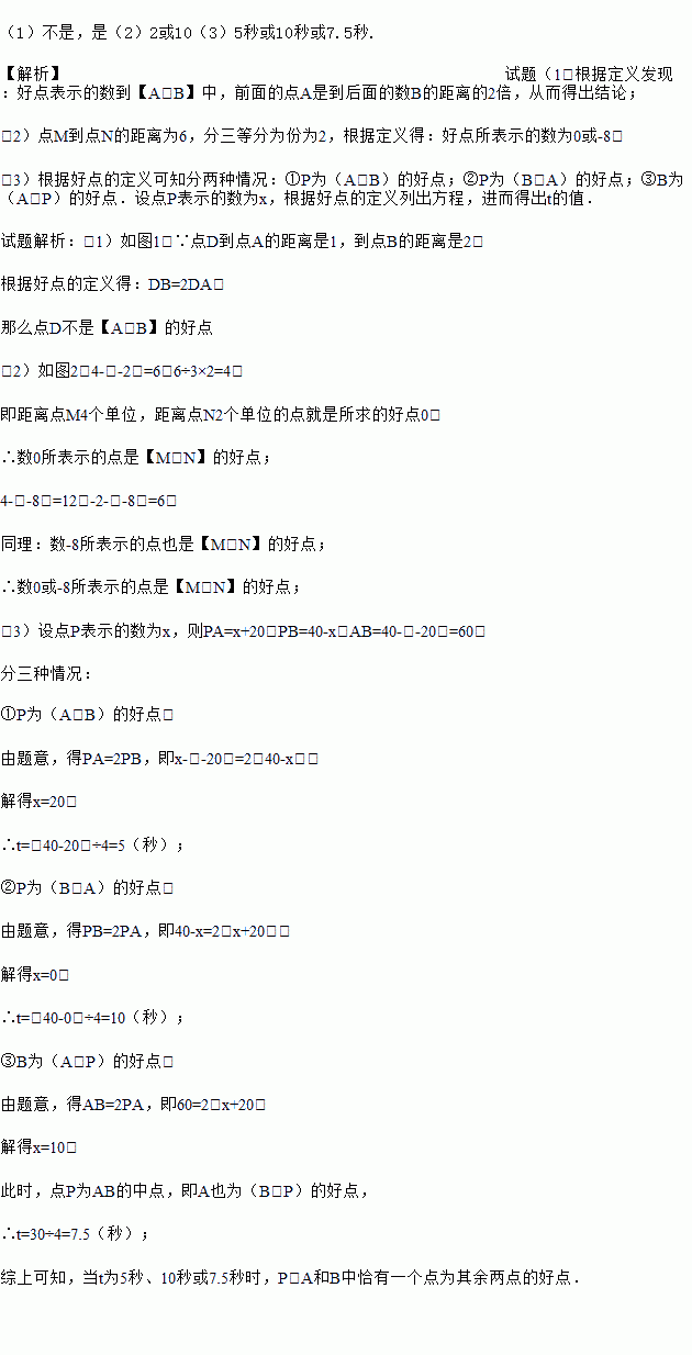 (1)如图1,点A表示的数为﹣1,点B表示的数为2.表示1的点C到点A的距离是2,到点B的距离是1,那么点C是【A,B】的好点; 又如,表示0的点D到点A的距离是1,到点B的距离是2,那么点D 【A,B】的好点,点D 【B,A】的好点.(请在横线上填“是”或“不是”)