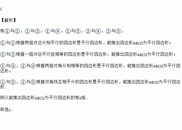 已知四边形ABCD的对角线相交于O,给出下列 5个条件:①AB∥CD ;②AD∥BC;③AB=CD ;④∠BAD=∠BCD;⑤OA=OC.从以上5个条件中任选 2个条件为一组,能推出四边形ABCD为平行四边形的有( )