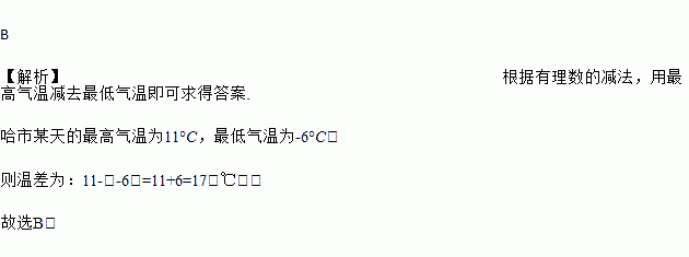 哈市某天的最高气温为11°C,最低气温为-6°C,则最高气温与最低气温的差为( )
