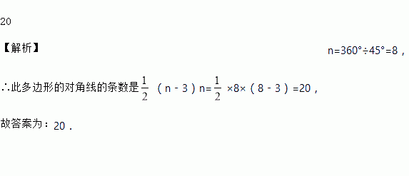 20 【解析】n=360°÷45°=8, ∴此多边形的对角线的条数是(n﹣3)n=×8×(8﹣3)=20, 故答案为:20.