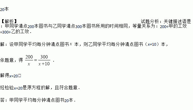 20本 【解析】试题分析:关键描述语是:甲同学清点200本图书与乙同学清点300本图书所用的时间相同,等量关系为:200÷甲的工效=300÷乙的工效. 【解析】 设甲同学平均每分钟清点图书本,则乙同学平均每分钟清点图书(x+10)本, 依题意,得 . 解得x=20. 经检验x=20是原方程的解,且符合题意. 答:甲同学平均每分钟清点图书20本.