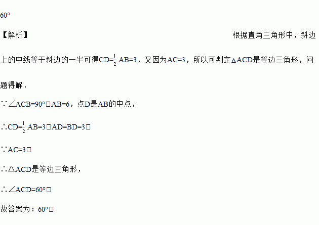如图,在Rt△ABC中,∠ACB=90°,AC=3,AB=6,点D是AB的中点,则∠ACD=_________.