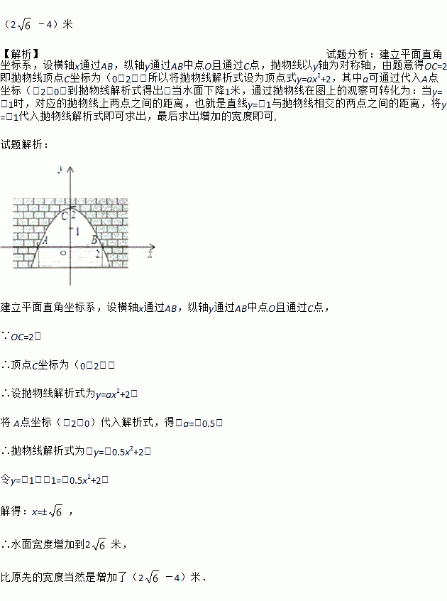 如图,是抛物线形拱桥,当拱顶离水面2米时,水面宽4米.若水面下降1米,则水面宽度将增加多少米?