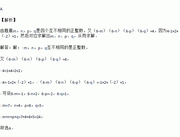 如果四个互不相同的正整数m,n,p,q满足(6-m)(6-n)(6-p)(6-q)=4,那么m+n+p+q=( )