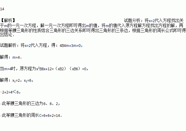已知2是关于x的方程:x2﹣2mx+3m=0的一个根,而这个方程的两个根恰好是等腰△ABC的两条边长,则△ABC的周长是__.
