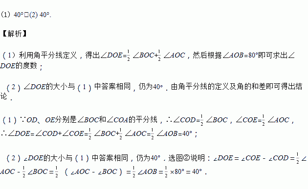 如图①,已知∠AOB=80°,OC是∠AOB内的一条射线,OD,OE分别平分∠BOC和∠COA.